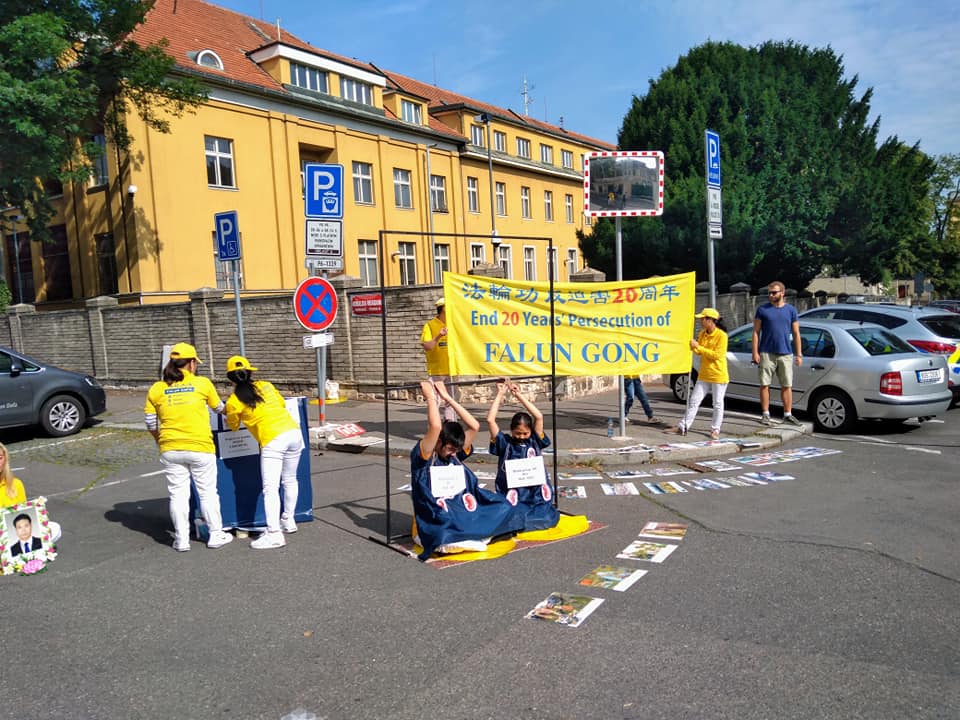Protestní akce v Praze pokračovala i 20. července, kde se praktikující sešli dopoledne před čínskou ambasádou, aby čínské představitele upozornili na stále probíhající zlovůli.