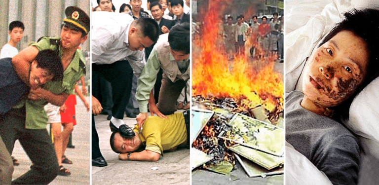 Začalo to uprostřed noci 20. července 1999. Po celé Číně, pod rouškou tmy, policie vytahovala občany z postelí. Mnozí byli odvezeni do záchytných center a věznic, jiní byli zbiti a někteří zemřeli na následky mučení. Komunistická strana Číny přikázala celostátní pálení knih, zakázala jejich vydávání a nařídila domovní prohlídky – vše s cílem zničit výukové materiály Falun Gongu. Státní podniky, školy i úřady zahájily povinná „přeškolovací sezení“, jejichž cílem bylo vykořenit tuto duchovní praxi a posílit komunistickou ideologii. Státní média zaplavila propaganda, která praxi démonizovala. Miliony nevinných lidí v Číně byly kvůli praktikování Falun Gongu propuštěny z práce, vyloučeny ze škol, uvězněny, mučeny nebo zabity.